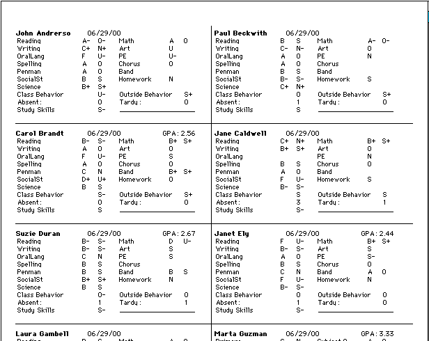 Below are two screen images of the All Grades Report. The first are standards-based performance indicators mixed with traditional grades. The second is a traditional set of grades. These are just two of the several possible combinations. Of course this report can be merged into the Letter with one click of the mouse.