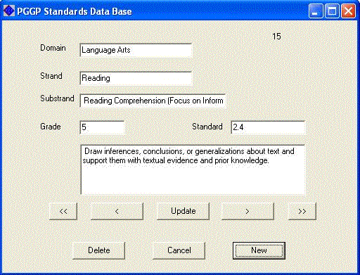 I do not have all the standards for all grade levels from all the states converted into import files. I certainly don't have your district's special take on standards made into import files. However, I can cook up a batch from state websites in minutes. (I am getting pretty good at it.) Teachers who purchase PGGP have priority. So, use the sample file to get the idea, or you can add standards manually, or you can take a try at creating the database. It is really not very hard. I am taking "donations" of files folks work up. No sense teachers reinventing the wheel.